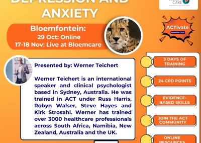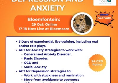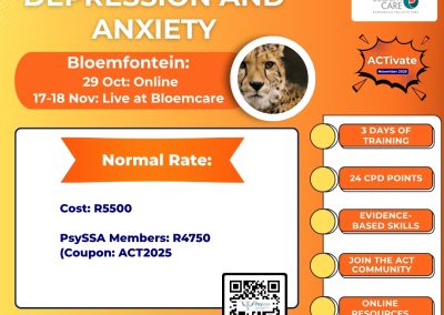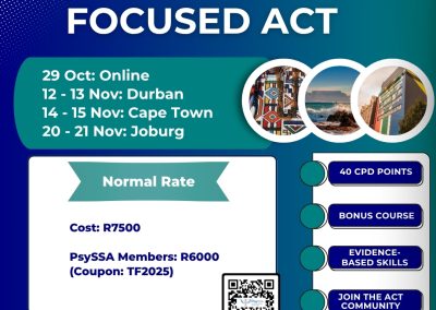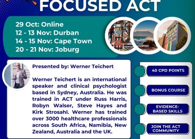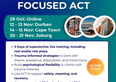 This 3-day workshop will be a Trauma Focused ACT deep-dive Into evidence-based interventions for trauma and related conditions. The in-person workshops will take place in Durban, Cape Town and Johannesburg. Bonus access to the ACT for Depression and Anxiety (on-demand) (16 CPD) courses are included.