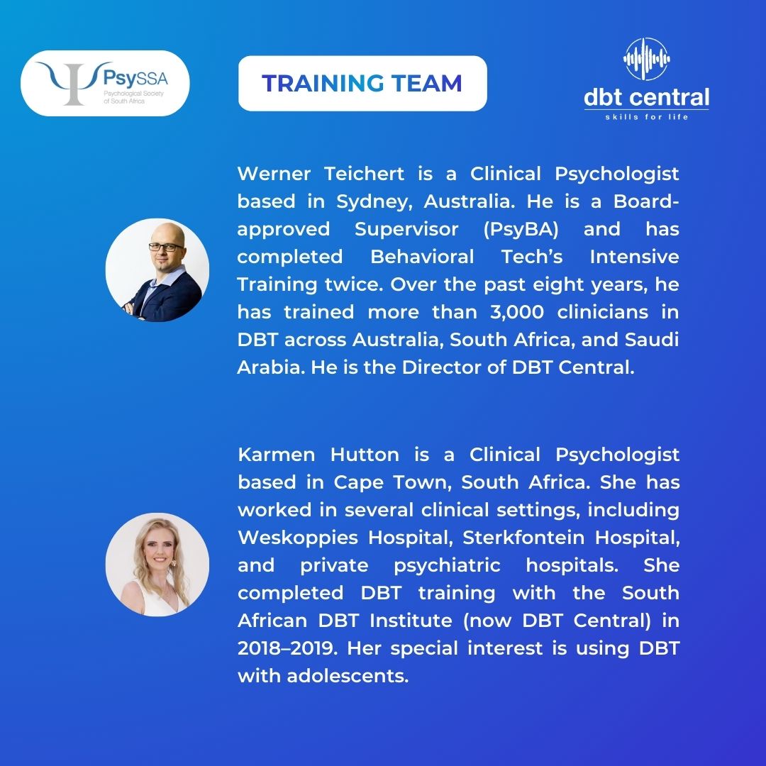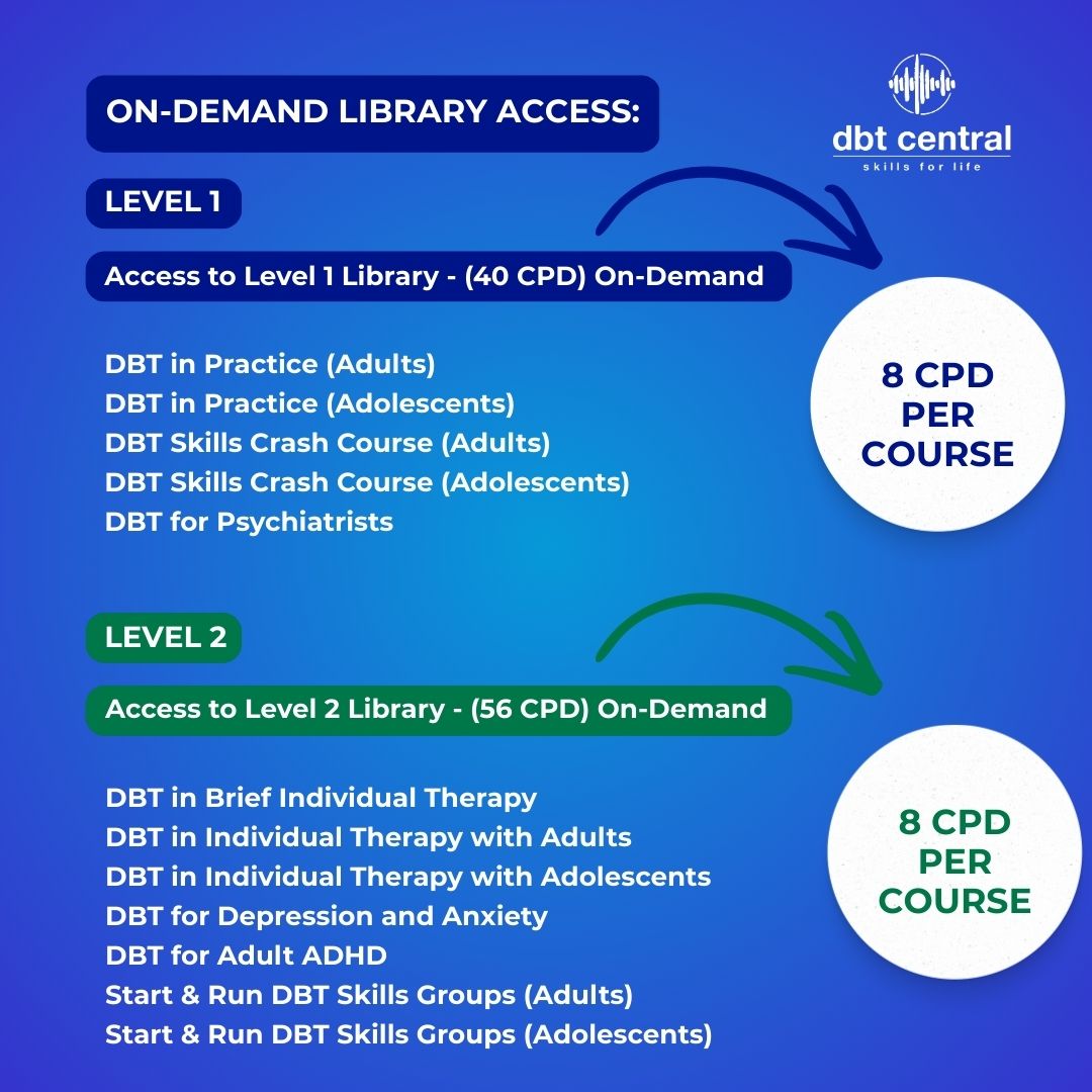 The programme covers DBT foundations, clinical application across presentations and populations, and advanced implementation, including programme development and therapy-interfering behaviours.