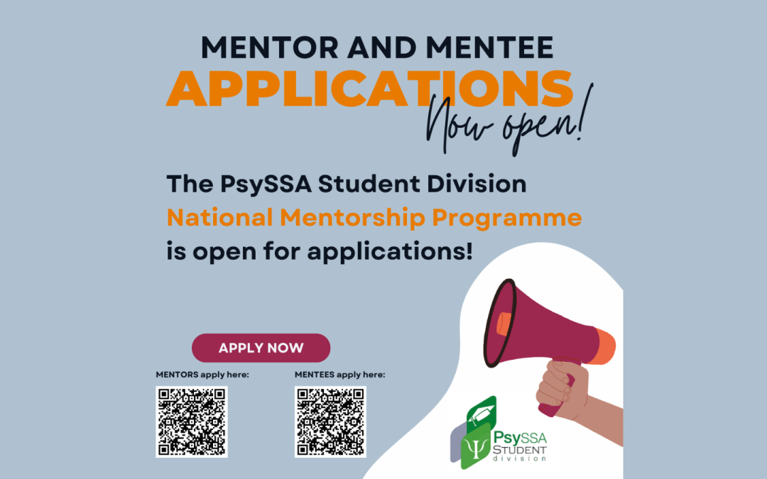The PsySSA Student Division are excited to announce that applications for the PsySSA Student Division National Mentorship Programme (2026) are now open for both mentees and mentors! Whether you’re looking for guidance or ready to inspire others, we want you. Don’t miss out – apply by 25 March 2026 and be part of this transformative experience